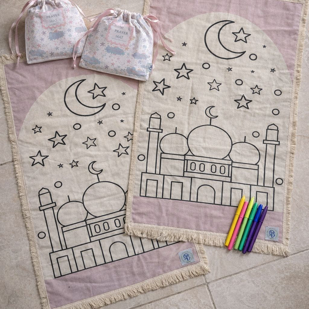 مصنوعة من قماش ناعم ومتين بألوان هادئة ومحايدة، وتتميز برسومات بسيطة لمسجد وهلال مرسومة بخطوط واضحة قابلة للتلوين. يمكن للأطفال تزيين سجادتهم باستخدام ألوان قابلة للغسل، ثم استخدامها للصلاة طوال الشهر الفضيل.
